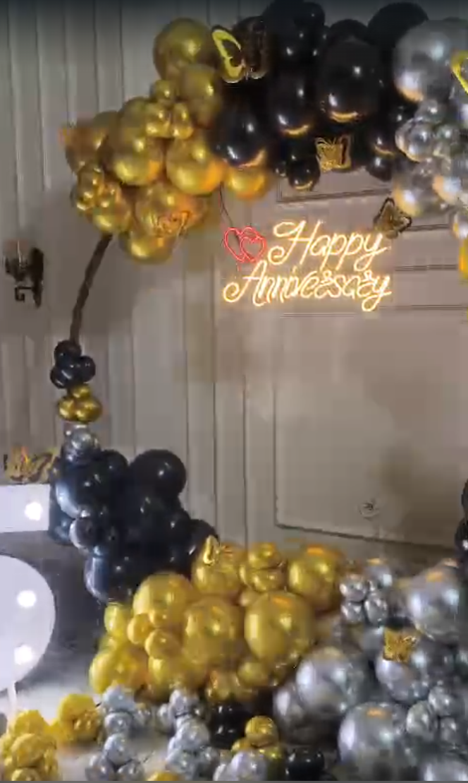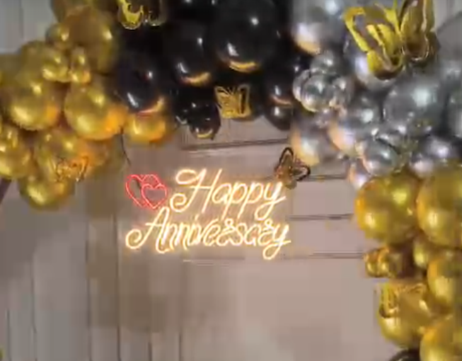 • The change this Metallic Anniversary Balloon Decoration in Ahmedabad can make to your special day at home will astound you! Imagine a magnificent 6*6 ring made up of 400 striking balloons in silver, maroon, and chrome blue! It would be like walking into a fantastical festival! Not only that, but there's more: a bright touch is added by the lovely Happy Anniversary neon light, which glows warmly overhead. Whimsical cutouts of butterflies' float over your celebration, and the striking 3-foot LED age indicator glows brightly. Not to mention the adorable cake center stand that simply screams to have those precious moments recreated! Await astonishment when you reveal your exquisitely designed area, either room or a banquet hall. This is an experience that will have everyone talking long after the last balloon pops—it's not just an anniversary decoration! Choose PartyOne - For setting up the perfect ambience and letting you have a laid-back celebration and enjoy a lovely and memorable anniversary celebrations and score those insta worthy pics! For a smooth celebration, have a reliable power supply and allocate PartyOne balloon decorators 3 hours prior to the event for everything to come together.