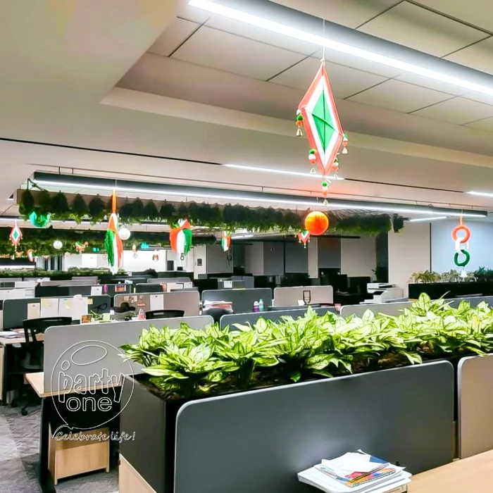 • Ceiling decoration featuring 50 tricolor paper honeycomb balls, kites, round hangings, and triangle bunting.