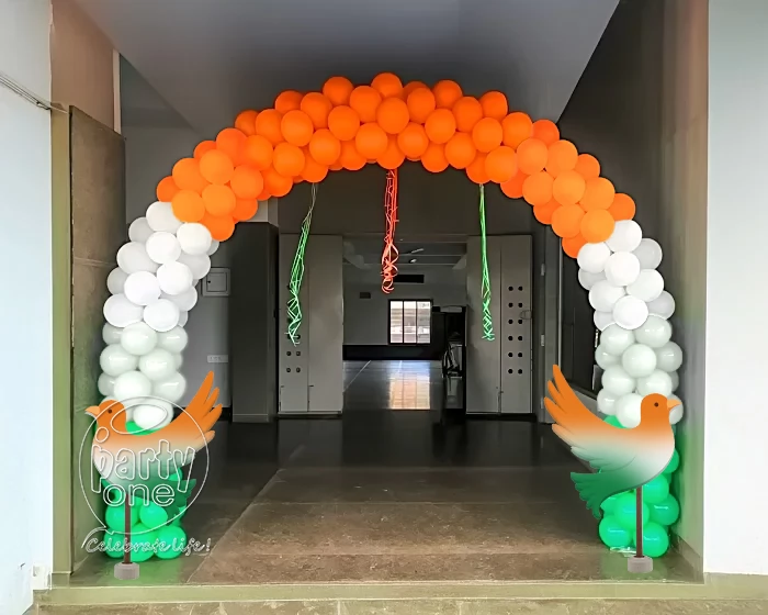 • 250 tricolor latex balloons in orange, white, and green decorate the entrance arch on the wall.