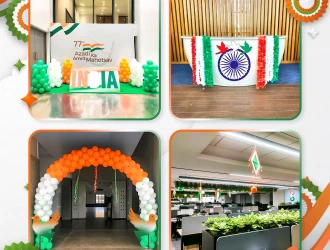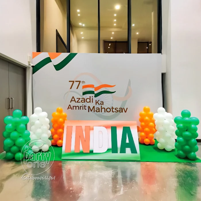 • Backdrop includes a 7*6 ft customized Independence Day flex banner with stand, a 5*8 ft green floor flex banner, a 4*2ft themed sunboard cutout with stand, and six tricolor balloon pillars in orange, white, and green.