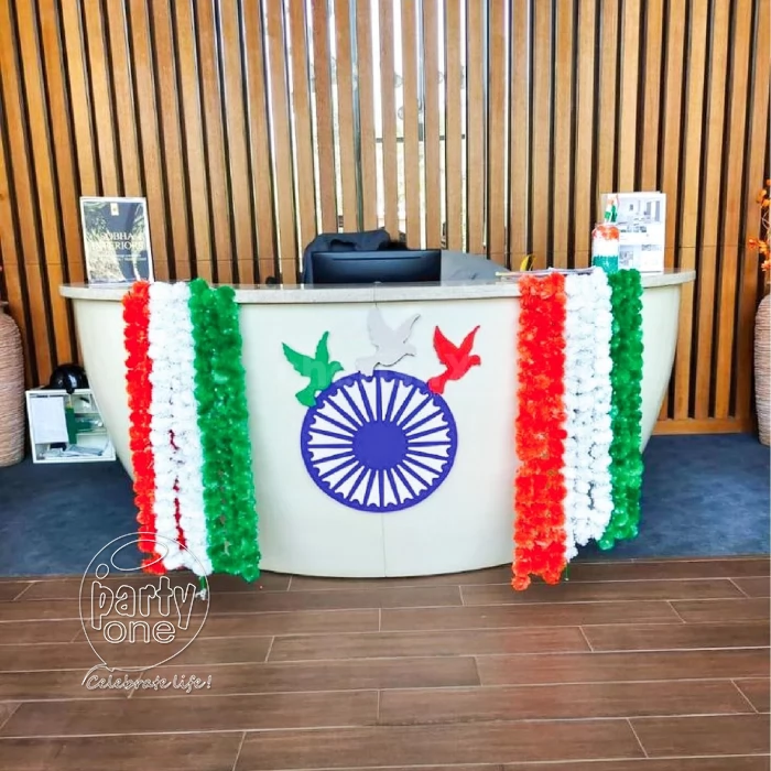 • Reception decor includes 18 tricolor marigold garlands, 3 tricolor birds paper cutouts, and 1 ashok chakra paper cutout.