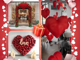 • 6*6 ft Heart-Shaped Photobooth on Stand with Rose Gold Love Foil and 400 Red Latex Balloons inside Black Balloons.
