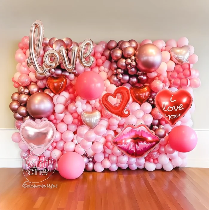 • XOXO silver (30 inches), two lips foil balloons, 600 balloons (red, pink, pastel, and white), and five heart foil balloons on a 6 by 7-foot silver love balloon wall