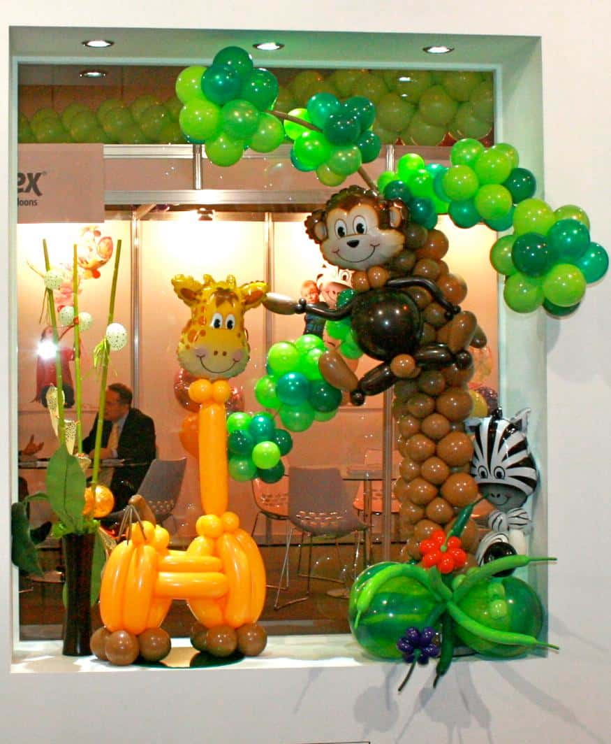 You can never go wrong with cute balloon twisted animals that bring joy to every party. A funny eared puppy balloon may be the overwhelming favourite but check this design out. A full-blown tropical jungle on display! You can see the cute giraffe, the monkey and the shy zebra in the picture. The design chops and changes accordingly to the animals you desire.