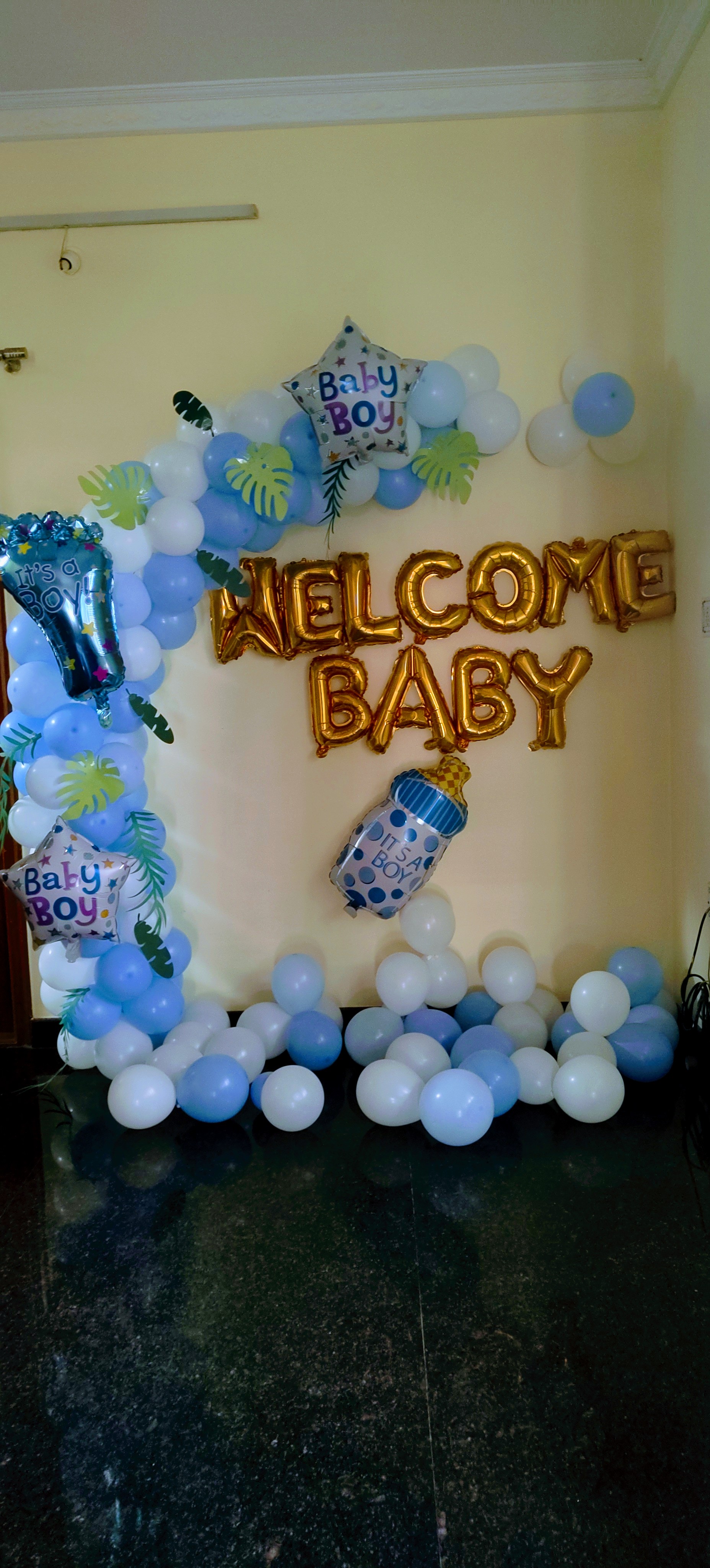 • This elegant setup is designed to create a memorable and visually stunning ambiance for celebrating the welcoming baby ceremony for your little one with the PartyOne’s enchanting Blue Half Arch Welcome Baby Decoration in Chandigarh. The magnificent balloon arch being the centerpiece of the decor, featuring blue and white balloons, best for the baby boy, painting the town in blue. This arch creates a dreamy backdrop, gracefully framing the celebration space. PartyOne brings in a delightful contrast, pop of colour by adding on baby boy theme foil balloons showing the joy and anticipation of your little one's arrival. To complete the ethereal and enchanting look, free-floating white and blue balloons are floated throughout space. This PartyOne decoration ensures a visually pleasing and memorable welcome baby celebration that your guests will never forget. For optimal setup, ensure a reliable power supply and allocate 3 hours for preparation before the event. Enjoy the blissful and insta worthy setting with Blue Half Arch Welcome Baby Decoration.