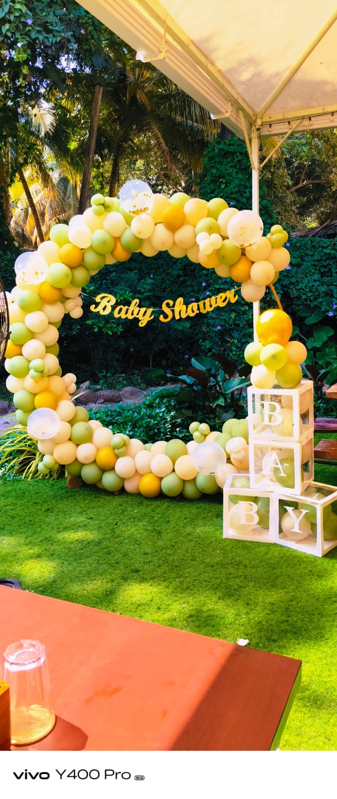 • Preparing to give a baby shower that fills everybody with a sense of happiness! Introducing PartyOne’s the Sunshine Swirl Baby Shower Ring Decoration in Chennai — like a whirl of wind filled with fun and joy, dancing in your celebrations. Imagine this — an amazing ring stand showcasing an attractive cursive banner as well as a sparkling balloon arch made from two hundred balloons, wherein 100 are light yellow while the other hundred are deep yellow, which will definitely put a smile on even the grumpy guest face. Do not go without those fabulous macaron balloons, cheeky golden confetti balloons, playful palm leaves and balloon pillar because who doesn’t want some extra jazz? Well, this balloon decoration is just the ultimate party kick-starter; it’s practically yelling at you to celebrate in style! And let’s not forget our whimsical BABY boxes bursting with fun balloons – this isn’t your regular get-together! Take your festivities up a notch and create memories filled with PartyOne balloon decoration services sunshine because every moment counts!