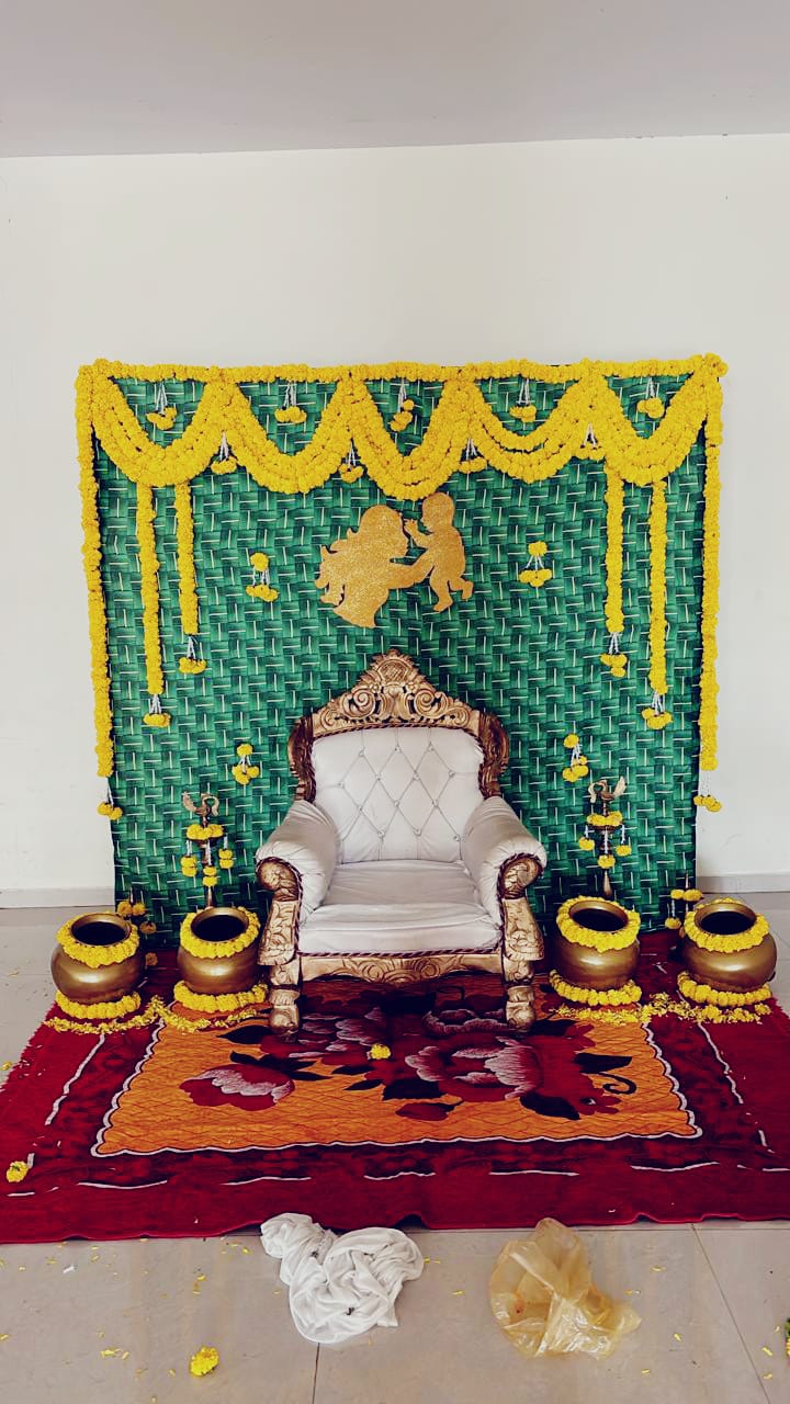 • 5 Half circle designs with marigold flowers on top of the backdrop