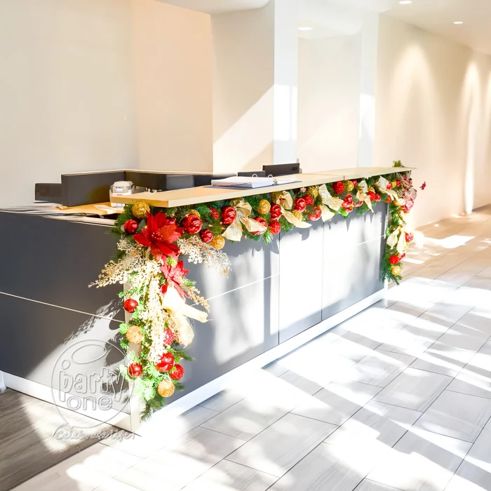 • 50 Assorted ornaments on the desk arch (Red, Gold, Green balls and ribbon's)