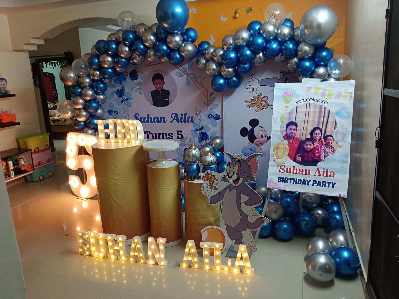 PartyOne is one of the best birthday event organizers. We do balloon decorations, stage decorations, car entry for kids, engaging activities like magic performance, game host, caricature, hair beading, 360 camera booth, live cartoon characters, mascots, and more. We provide live eateries like cotton candy, chocolate fountain, popcorn, etc. If you're planning for a budget-friendly celebration at home, then we can go with simple wall decoration at home, with a magician to engage the guests and family members. A chocolate fountain would be a go-to option for a budget-friendly setup. But if your budget is high and you're looking for a grand celebration, go with themed birthday decorations like jungle theme, Cocomelon theme, etc. Adding live cartoon characters that match the theme, with a juggler or tall man, can be the best option. Then adults' and kids' indoor activities would be the best option to engage the guests and kids. For eateries, adding popcorn, cotton candy, and chocolate fountain can be the best option. Lastly, a birthday photographer and videographer would be best to capture all the moments.