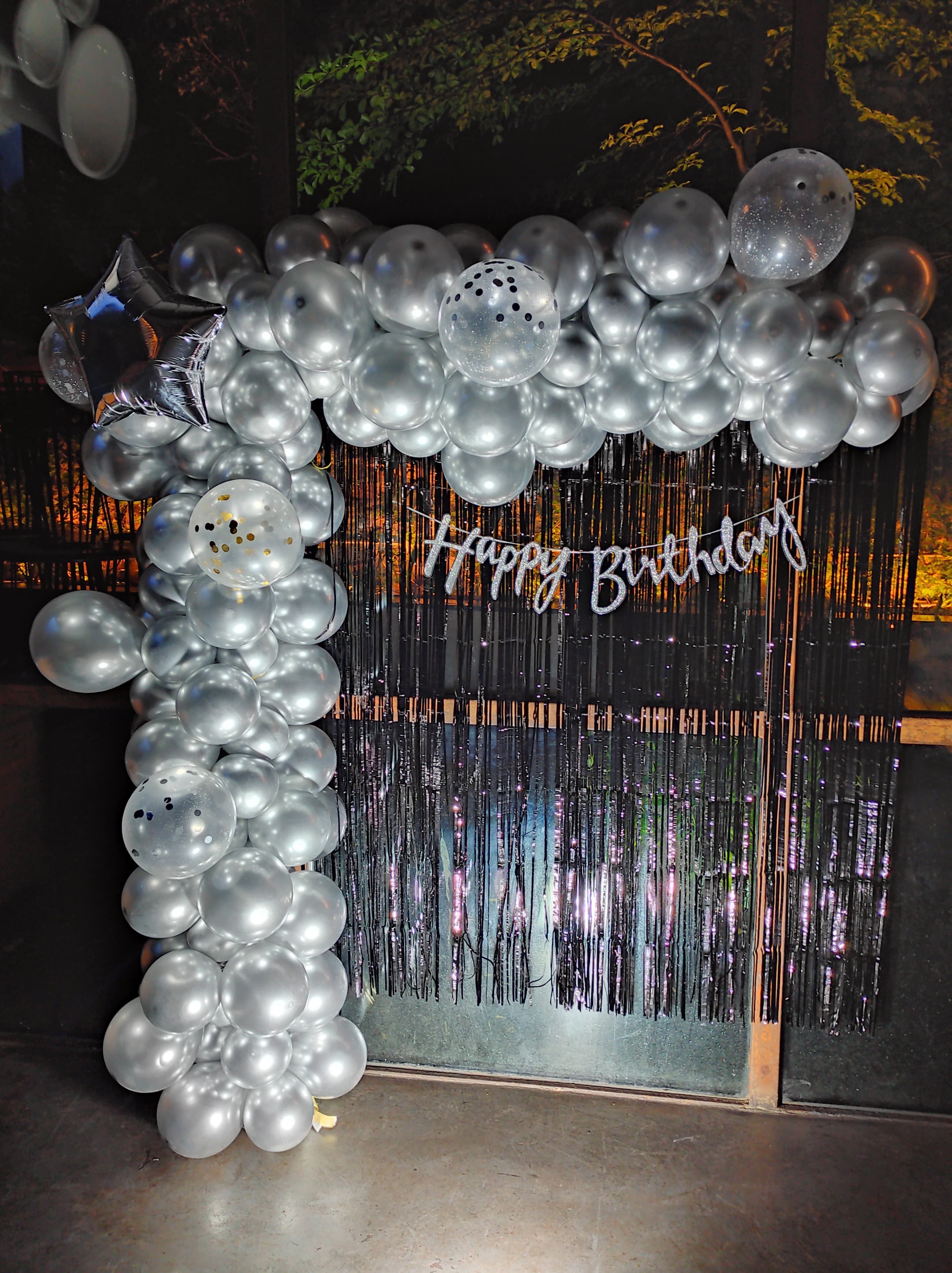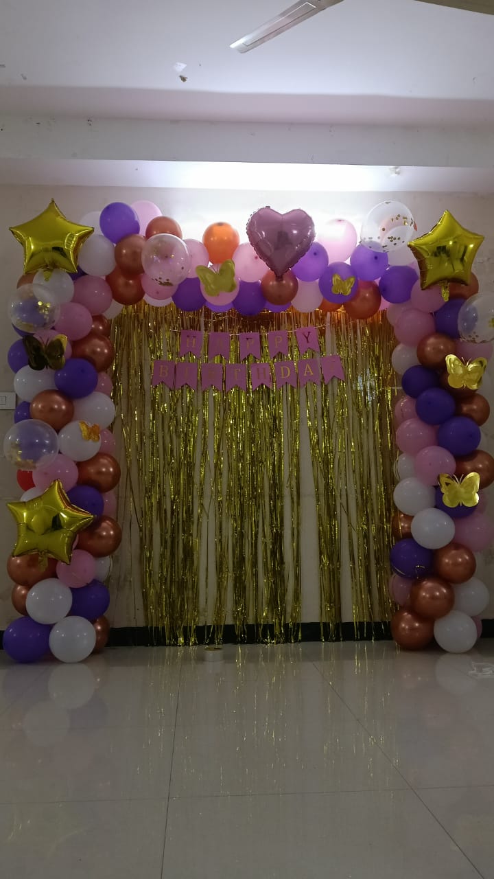 • Balloon arch of 250 balloons (Baby pink, White, Purple and Rose gold chrome color) on the wall