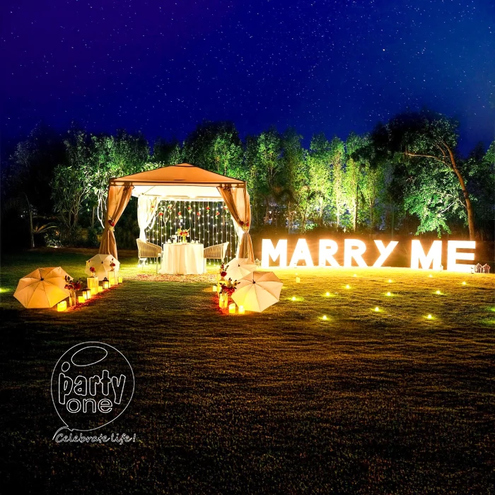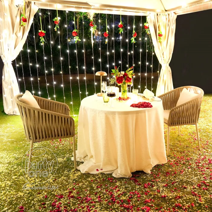 • Romantic cabana proposal decor: Featuring a fairy light-adorned cabana, floral accents and ambient LED candles.
