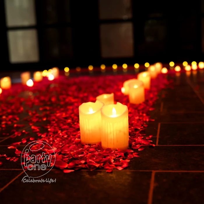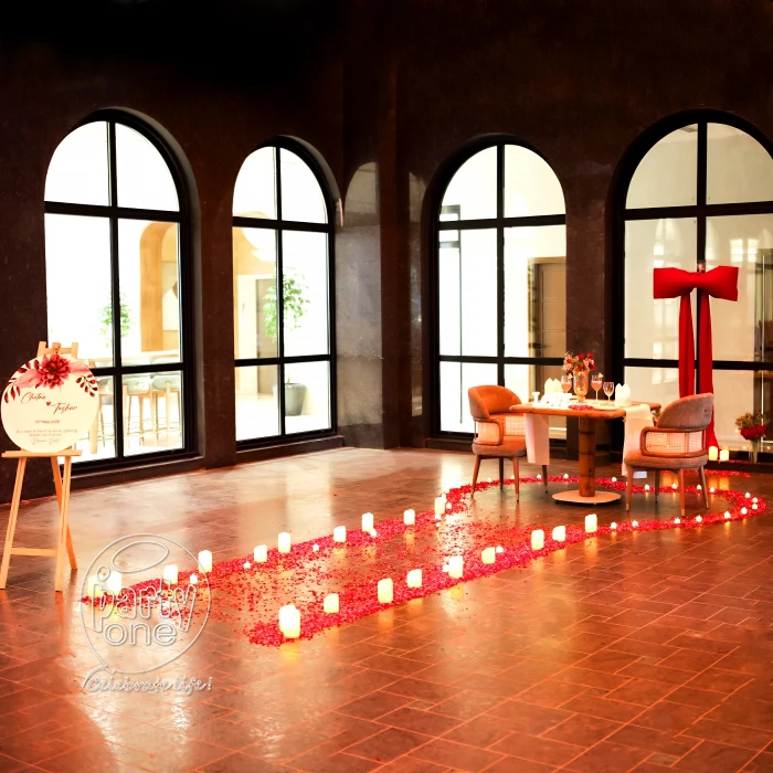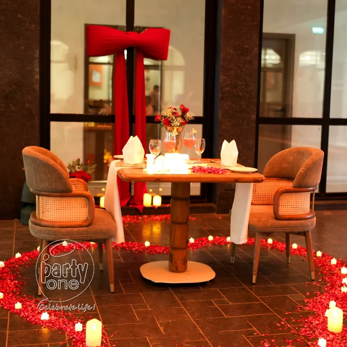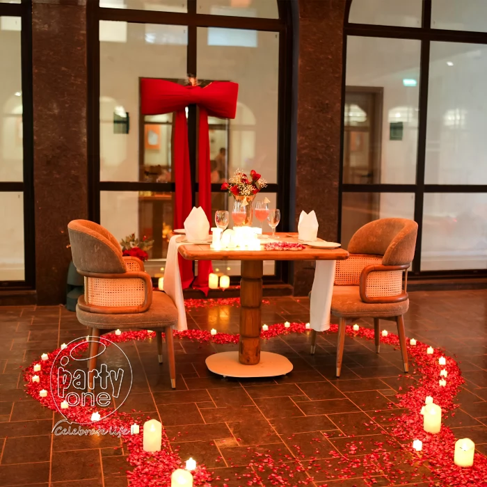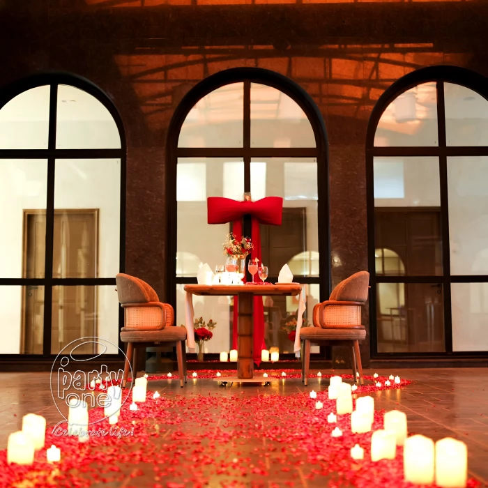• Beautifully decorated private table with floral centerpiece, candles, rose petals, and red bow backdrop