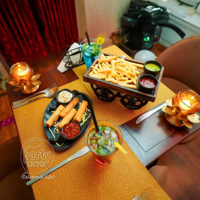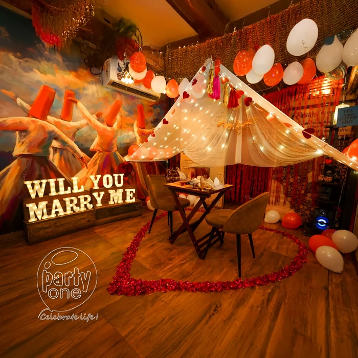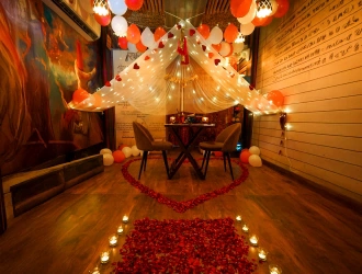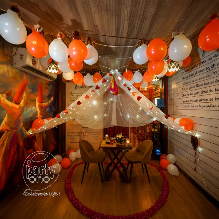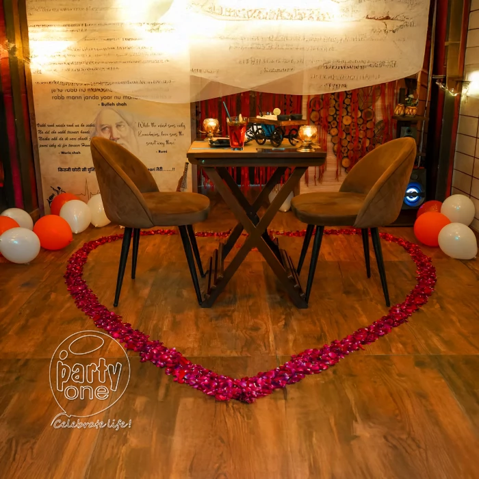 • Decorations - Beautiful sit down tent style Cabana dining decorated with fairy lights, half kg rose petals, candles and 50 Pcs balloons
