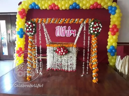 Organizing a naming ceremony is a beautiful way to celebrate a new life in your life. You can celebrate this memorable day in several ways. However, there are a few essentials that only a professional naming ceremony decoration at home planner is aware of. You can avail of PartyOne professional services to throw a party that everyone will remember for years! Our professional naming ceremony decorators take care of everything from picking a date and time that works best for your friends and family to creating a guest list comprising close family members and loved ones. We also help you select a theme that reflects your taste based on colors, nature, or the season. But that's not the only naming ceremony decoration service we offer. PartyOne's baby naming ceremony essentials include decorating the venue with balloons and flowers to transform it into a festive and welcoming space. We also arrange a panditji for the pooja if you are going for a traditional theme. They perform all the rituals as per the authentic vidhi and give the newborn a meaningful name. Besides this, the naming ceremony services offer essentials include photography and videography services to capture precious moments in a timeless frame with absolute proficiency. Our professional cradle ceremony decorators are the masters of the craft, who have been in the field for over 5 years. From baby photography to maternity shoots, they do everything in between in a unique manner! Avail yourself of our professional services at the next naming ceremony to honor your child's name and make the day memorable. Since this occasion is one of the greatest joys in a parent's life, it must be hosted only by the experts!
