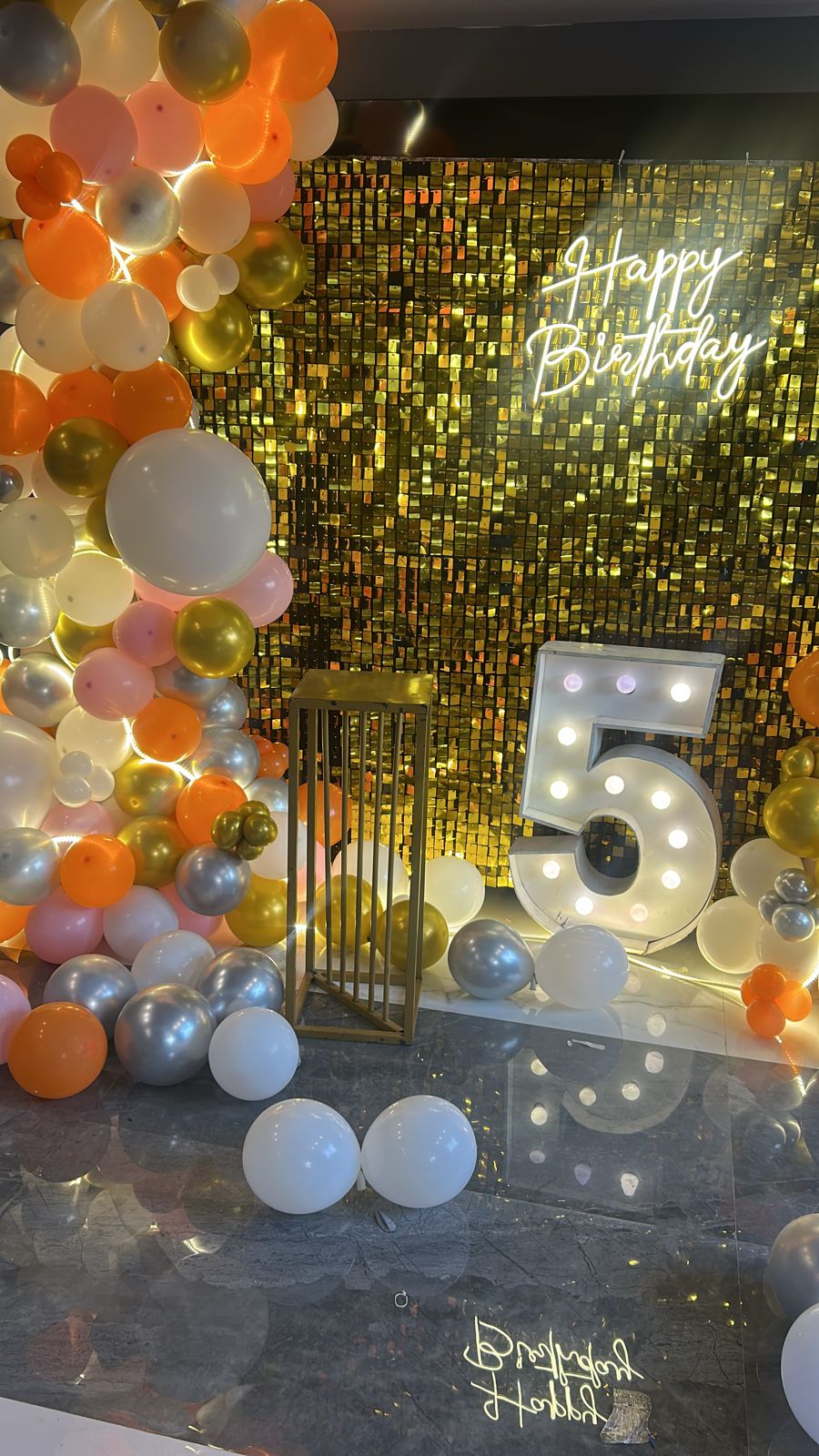 • Balloon arch of 300 balloons (White, Orange, Baby pink, Silver chrome and Golden chrome color)