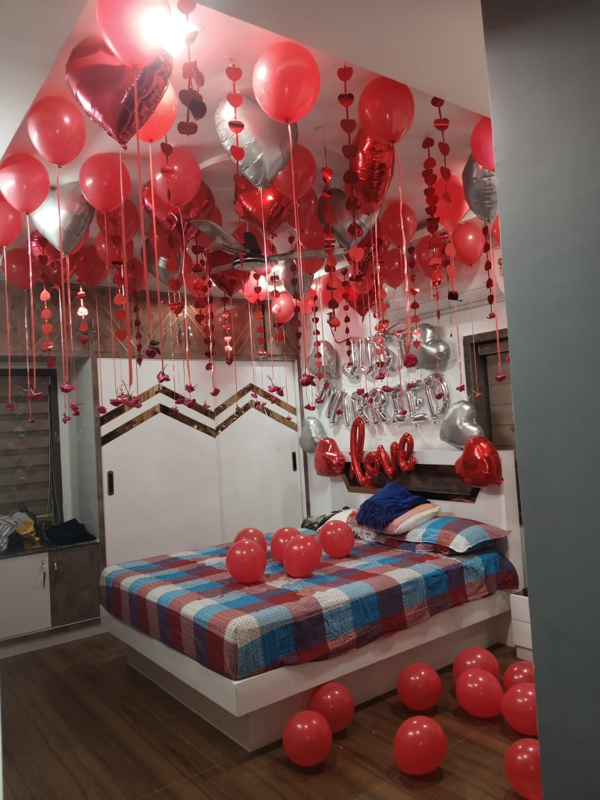 • Want to set up a wedding night bedroom decoration in Indore that’s straight out of a fairytale? PartyOne has its Wedding Night Just Married Bedroom Decoration, just for that. This is the ultimate way to set the stage for romance and fun. As you walk into a room with red heart balloons with ribbons floating on the ceiling, alongside red and silver heart-shaped foil balloons on the wall, it is like putting on heart shaped sunglasses. Walls adorned with a dazzling red cursive “Love” balloon and silver “JUST MARRIED” foil balloons along with pixel lights complete the look. It's not just a decoration—it's romance! Ready to fall in love all over again? Choose PartyOne — For setting up the perfect ambience and letting you have a laid-back celebration! For a smooth celebration, have a reliable power supply and allocate PartyOne balloon decorators 3 hours prior to the event for everything to come together.