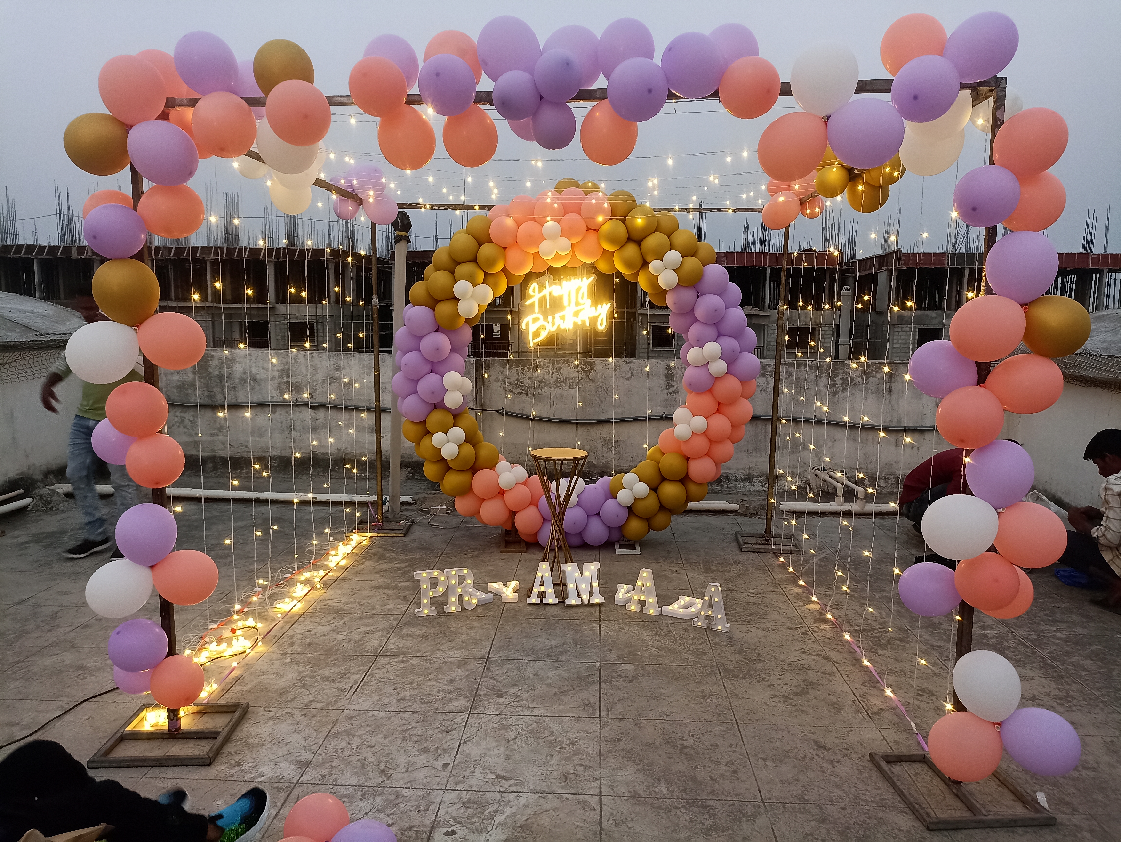 • Ring arch of 250 balloons (Chrome gold, Purple, Peach and White)