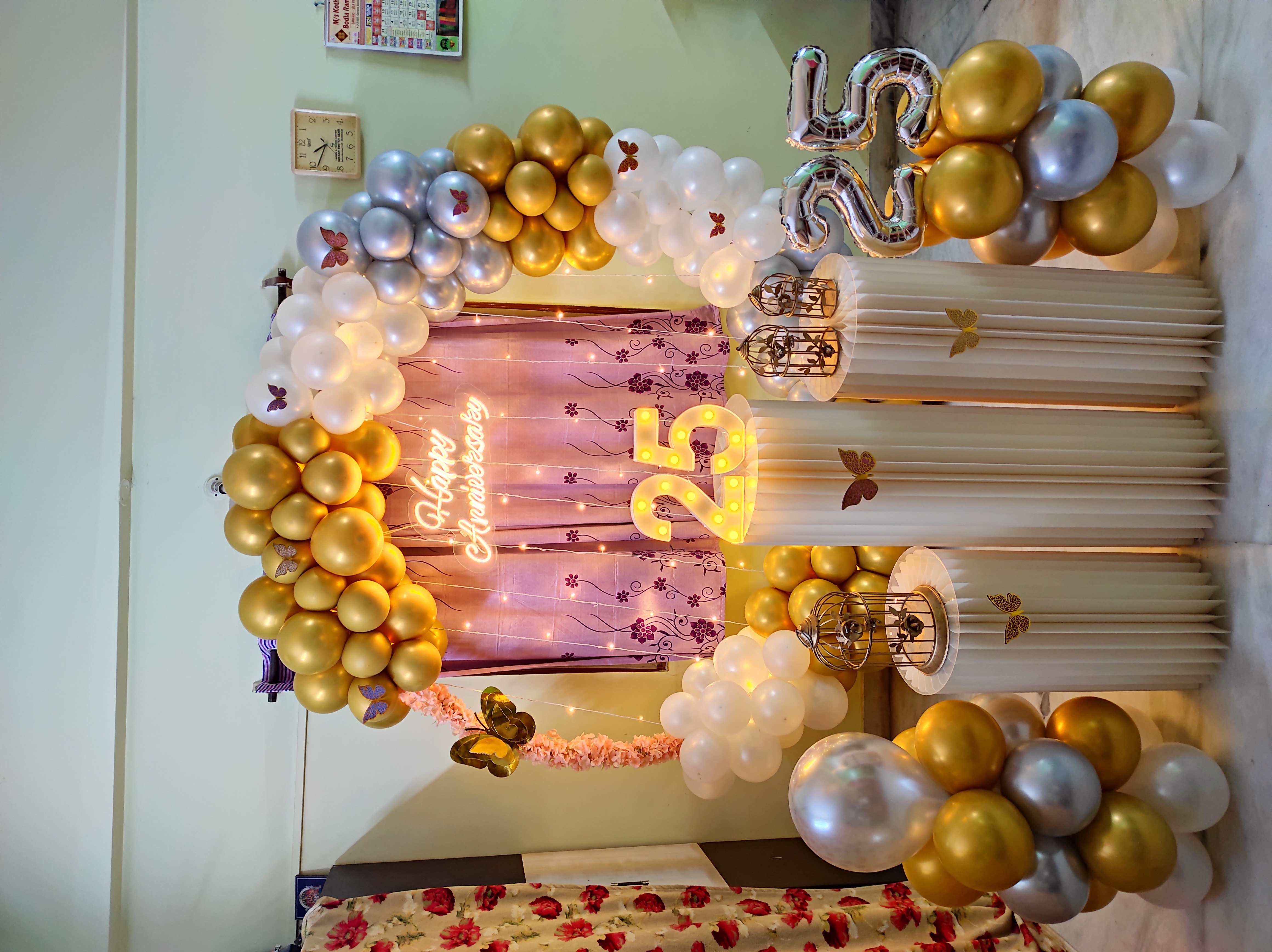 Marking five decades of togetherness should be celebrated either with a grand celebration or a simple celebration at home. For 50th anniversary decoration, people typically follow golden themes, pastel themes, etc. Begin with a stunning anniversary stage decoration using golden drapes, lights, and flower decoration. If you're celebrating at home, happy anniversary decoration at home with balloons, candles, and a golden cake table can make the occasion feel more grand yet romantic. Use printed photo boards showing life over the decades. Include a cake featuring a classy anniversary topper wedding cake and consider subtle lighting for evening charm. For a more dramatic effect, go with anniversary balloon decoration using metallic gold and pastel for balloon arches or backdrops which can be romantic and beautiful. Add a large “50” centerpiece to signify the milestone. Whether it’s a banquet or a home gathering, your parents’ 50th anniversary decorations should reflect the life of their story. Working with home decorators for anniversary events can ensure every element from colors to layout feels meaningful. After all, 50 years of love deserves to be celebrated with beauty, tradition, and lots of golden sparkle.