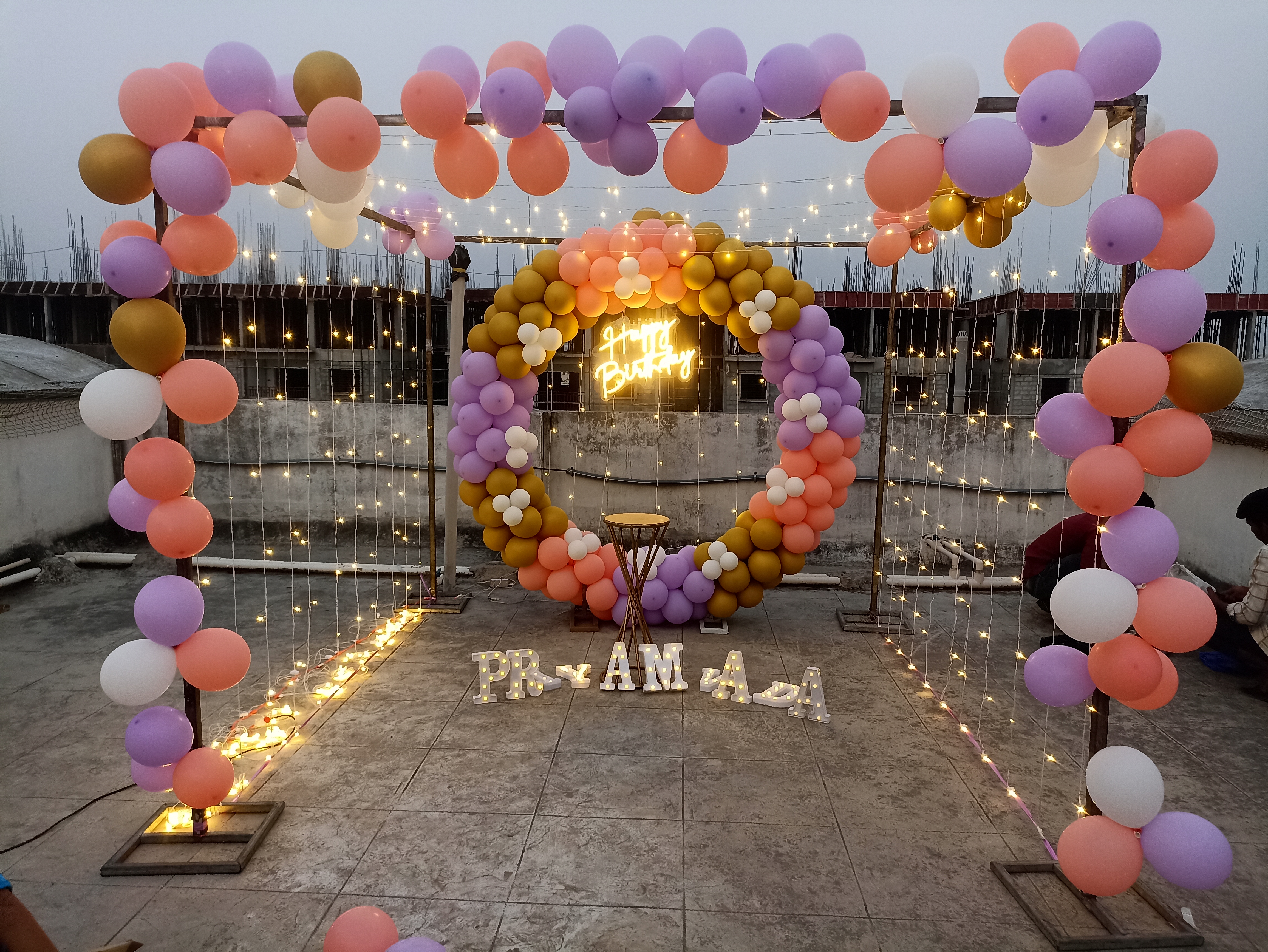 • Ring arch of 250 balloons (Chrome gold, Purple, Peach and White)