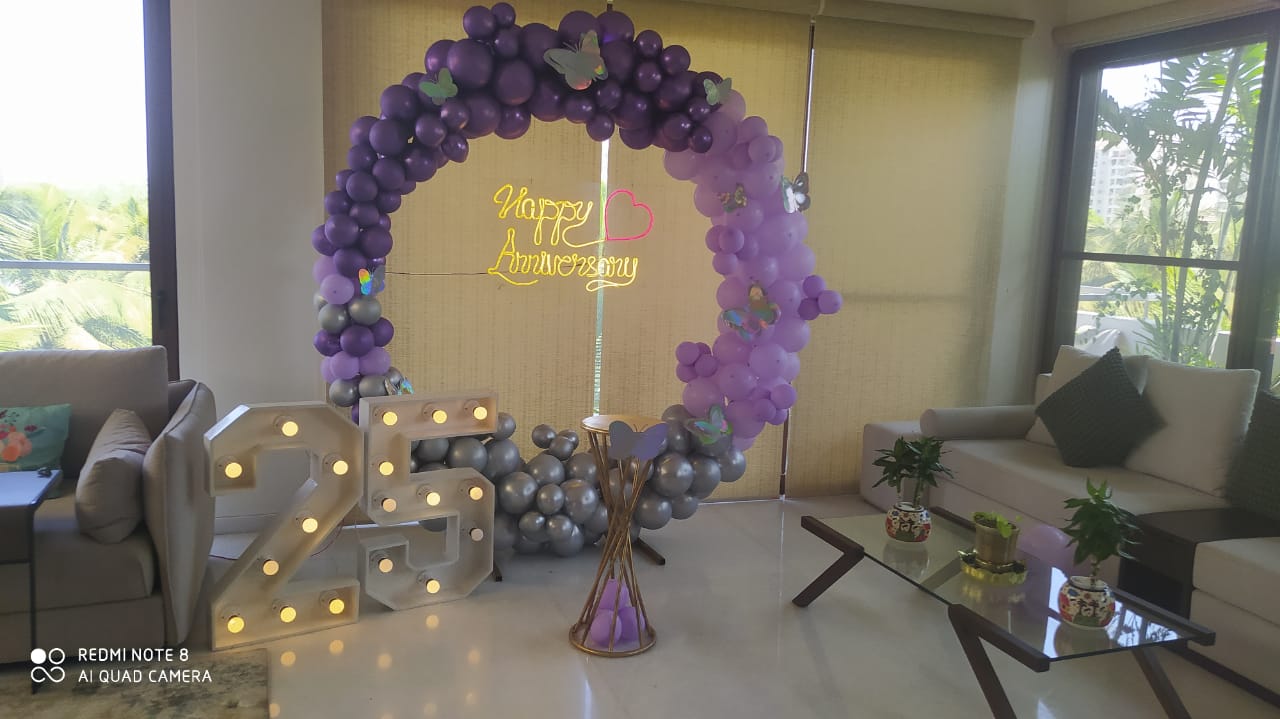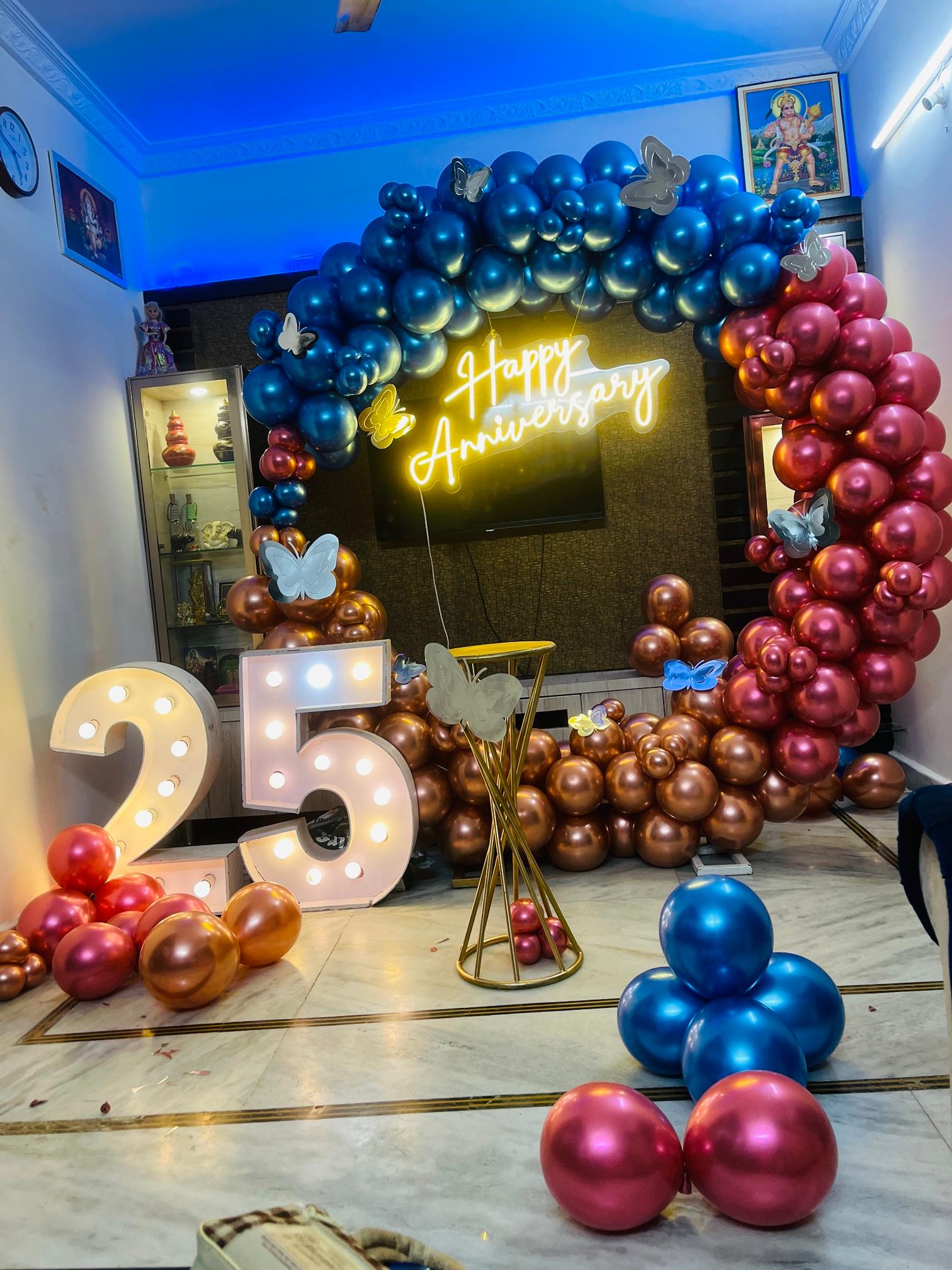 • The change this Metallic Anniversary Balloon Decoration in Mangalore can make to your special day at home will astound you! Imagine a magnificent 6*6 ring made up of 400 striking balloons in silver, maroon, and chrome blue! It would be like walking into a fantastical festival! Not only that, but there's more: a bright touch is added by the lovely Happy Anniversary neon light, which glows warmly overhead. Whimsical cutouts of butterflies' float over your celebration, and the striking 3-foot LED age indicator glows brightly. Not to mention the adorable cake center stand that simply screams to have those precious moments recreated! Await astonishment when you reveal your exquisitely designed area, either room or a banquet hall. This is an experience that will have everyone talking long after the last balloon pops—it's not just an anniversary decoration! Choose PartyOne - For setting up the perfect ambience and letting you have a laid-back celebration and enjoy a lovely and memorable anniversary celebrations and score those insta worthy pics! For a smooth celebration, have a reliable power supply and allocate PartyOne balloon decorators 3 hours prior to the event for everything to come together.