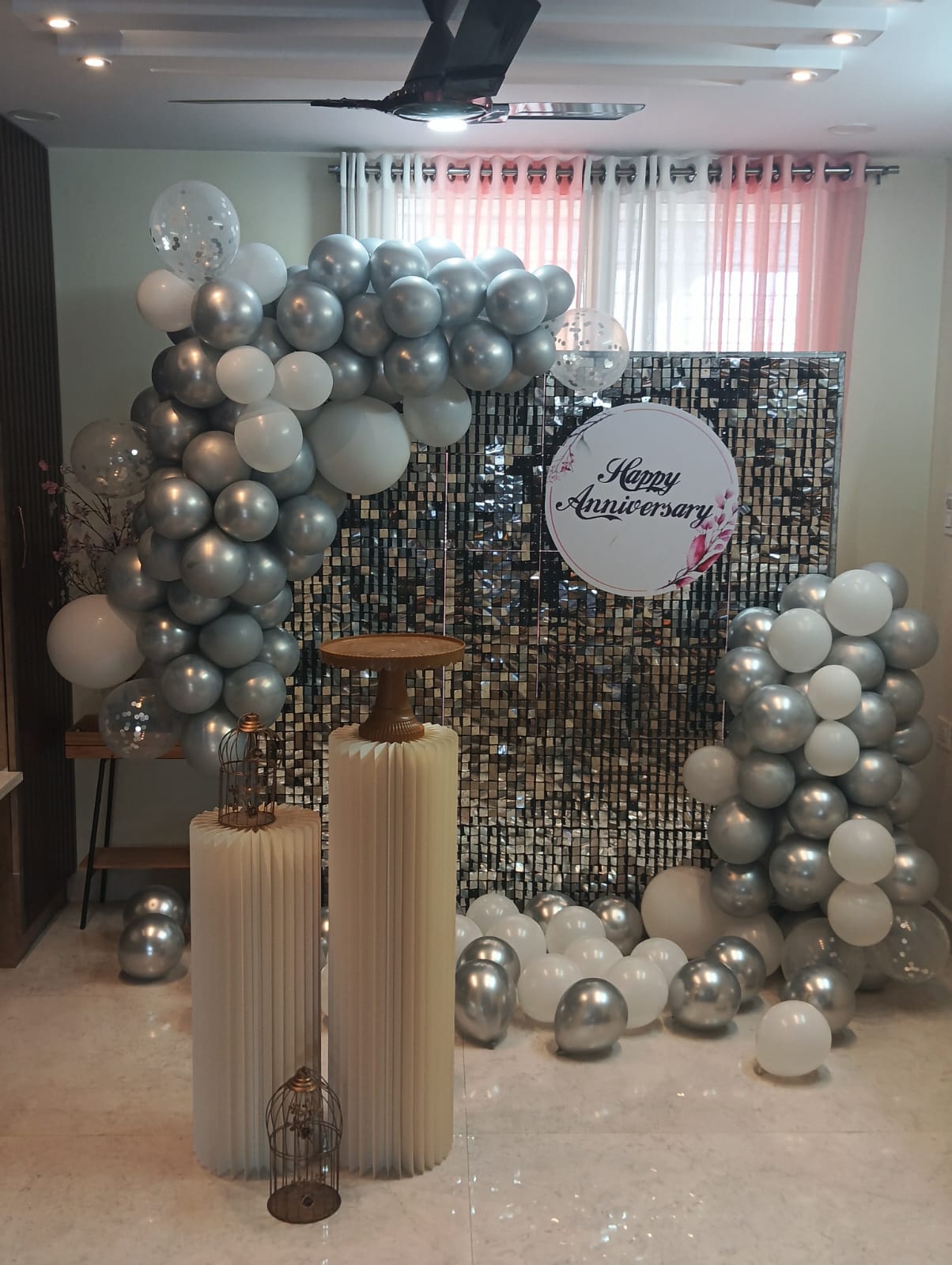 • This exquisite decoration is designed to create a visually stunning and unforgettable atmosphere to make your Anniversary. Be celebration shine with PartyOne Shimmery Silver Sequin Anniversary Decoration in Mangalore. Throw an Unforgettable Shimmery Silver Theme Anniversary Party with silver sequin all the way home with PartyOne Balloon decoration services. Experience elegance with Mesmerizing Decoration. For the beautiful centerpiece a dazzling silver sequin backdrop which glimmers under any light, measuring 6×6 ft, sets the perfect stage for photos with loved ones in a glamorous ambiance. For a warm invite to enhance the festive mood, sun pack board greeting “Happy Anniversary” gives a vibrant and modern touch. Dynamic depth and texture to the decor is added by balloon arch, featuring a stunning mix of white, and silver chrome balloons with cake stands. Proudly standing macron balloons enhance the grandeur of the setup! This eye-catching arrangement is sure to be a highlight for the celebration and all guests at the Anniversary party. For a smooth celebration, have a reliable power supply and allocate PartyOne balloon decorators 3 hours prior to the event for everything to come together.