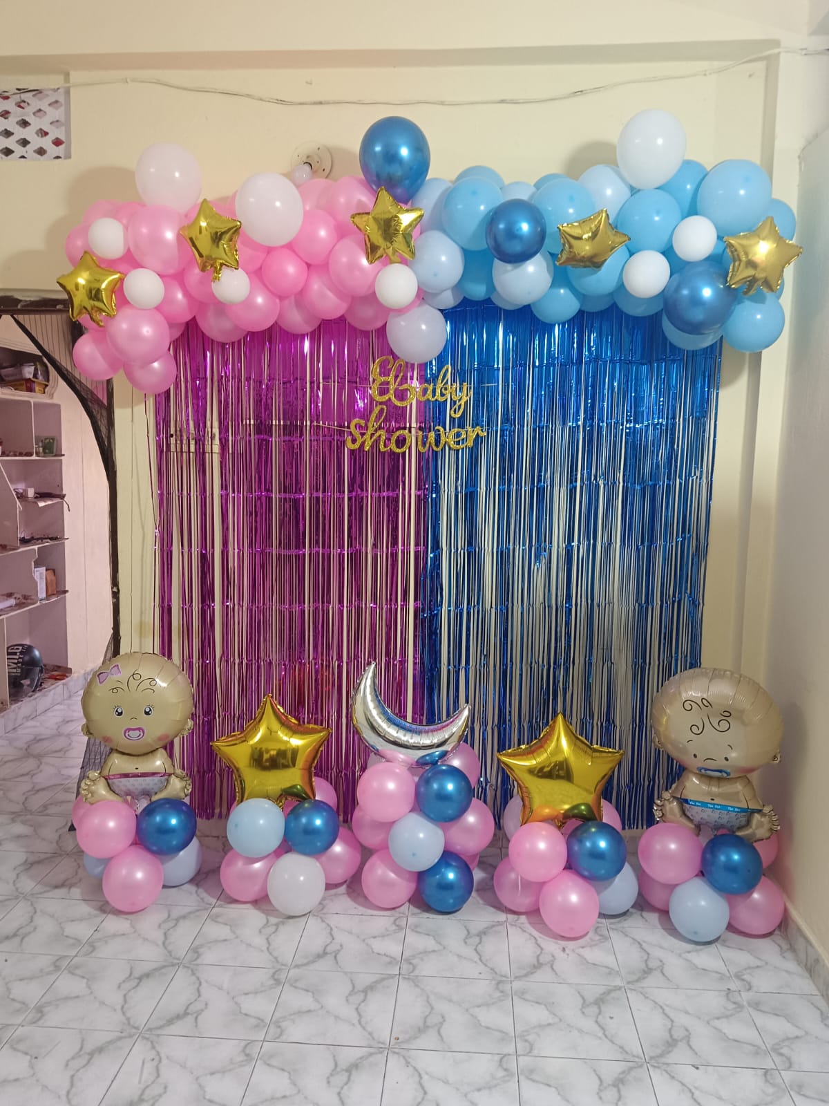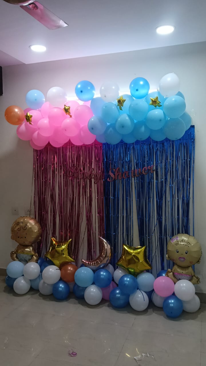 • Inviting an infant into this world may be a brilliant minute, which ought to be celebrated at each moment. For a cuddly baby shower celebration for the modern mother, book from PartyOne! Our cute setup will bring warmth, charm, and a touch of tastefulness to your celebration in Mumbai. Begin with a brilliant "Baby Shower" bunting that sparkle with delight. The swell curve, a delightful blend of pink, blue, dark blue chrome, and white latex inflatables, makes a marvellous background culminate for capturing valuable minutes. Including a sprinkle of enchantment are two rose gold chrome inflatables and thwart ornament shades in blue and pink. Five star-shaped brilliant thwart inflatables shimmer like twinkling stars, whereas a silver moon-shaped foil swell stands tall on its 1 ft swell column, making a charming scene. A lovely child young lady and child boy confront foil inflatables on their 1 ft swell columns bring a lively touch to the stylistic layout. Two brilliant star-shaped thwart inflatables moreover stand gladly on 1 ft balloon columns, including to the happy climate. The pixel light washes the space in a delicate glow, making everything seems indeed more charming. Keep in mind, you'll require a dependable power supply and three hours for setup. Get prepared for a cuddly, insta-worthy welcoming baby shower!
