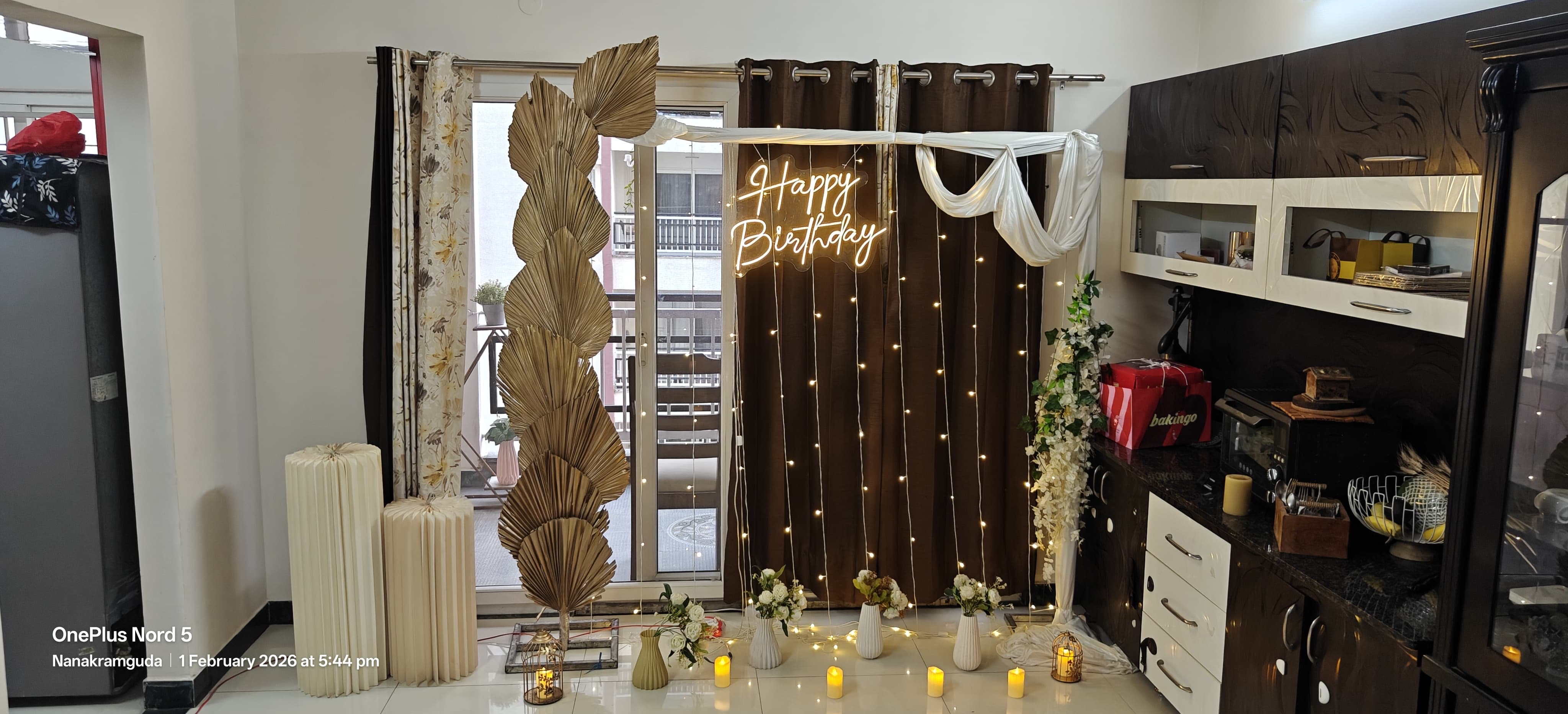 Planning for birthday celebrations at home, you don’t need to spend a lot to make it special. Here are some easy and affordable simple birthday decoration ideas at home that you can try. Balloon Decoration: Use colourful balloons like pastel colours, jungle theme colours, to decorate the wall with some foils. You can make a simple balloon arch or balloon bunch for the cake cutting area. Create a ready-made or DIY happy birthday banner to add a special love for your loved ones. Paper Decoration: Using different colour paper and make stars, hearts. Tape them on the wall or hang them from the ceiling for a better look. Add LED lights to the decoration to create a warm and beautiful environment. Make some DIY photo booth using balloon decoration, curtains, and some props — it is a great way to create memories. Here are some types of birthday decoration at home: birthday room decoration, terrace decoration, balcony decoration. Want hassle-free birthday decoration at home ? Contact PartyOne for easy, quick, and budget-friendly setup!