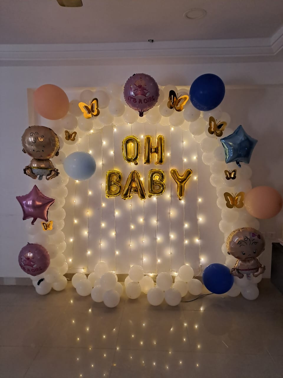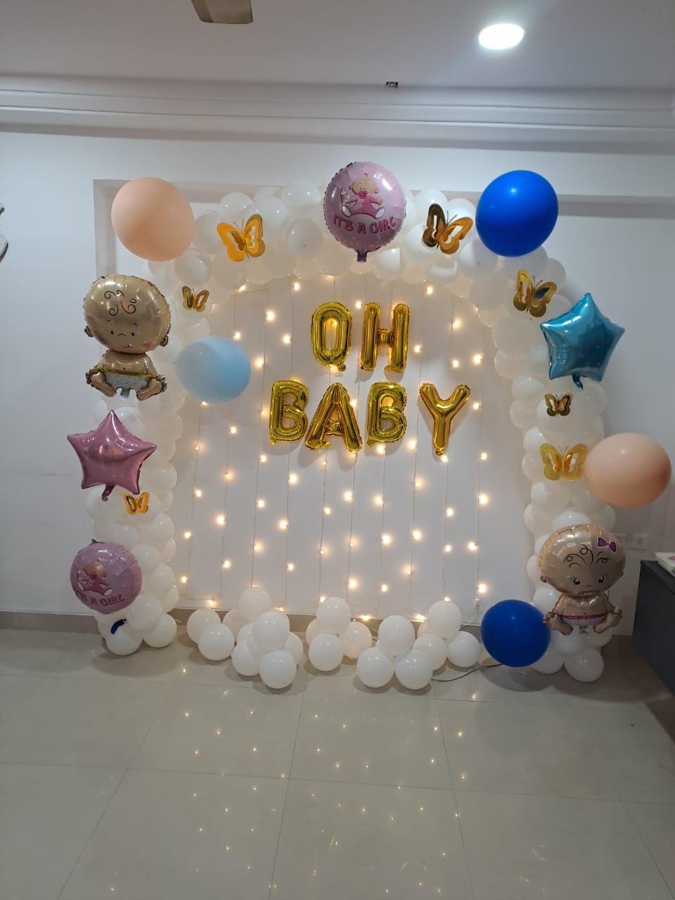 • This elegant setup is designed to create a memorable and visually stunning ambiance for celebrating the arrival of your little one with the enchanting pure bliss white baby shower decoration in Pune. The magnificent balloon arch being the centerpiece of the decor, featuring 100 white latex balloons. This arch creates a dreamy backdrop gracefully framing the celebration space. For bringing in a delightful contrast, pop of color is added with four pastel blue and two pastel pink 18-inch balloons showing the joy and anticipation of your little ones arrival. The dazzling " Oh Baby" golden foil balloon is at the heart of decoration, catching the light and adding the touch of glamour to the celebration. A warm inviting atmosphere is created by setting up the gentle glow of the two-pixel lights - perfect for a joyful gathering. To bring whimsical and fun elements five charming foil balloons, each with adorable baby shower designs and seven golden butterflies are delicately placed around the venue enhances the baby shower theme, putting an elegant ambience. To complete the ethereal and enchanting look, 30 free-floating white balloons are floated throughout space. This decor package ensures a visually pleasing and memorable baby shower celebration that your guests will never forget. For optimal setup, ensure a reliable power supply and allocate 3 hours for preparation before the event. Enjoy the blissful and insta worthy setting with pure bliss white baby shower decor.