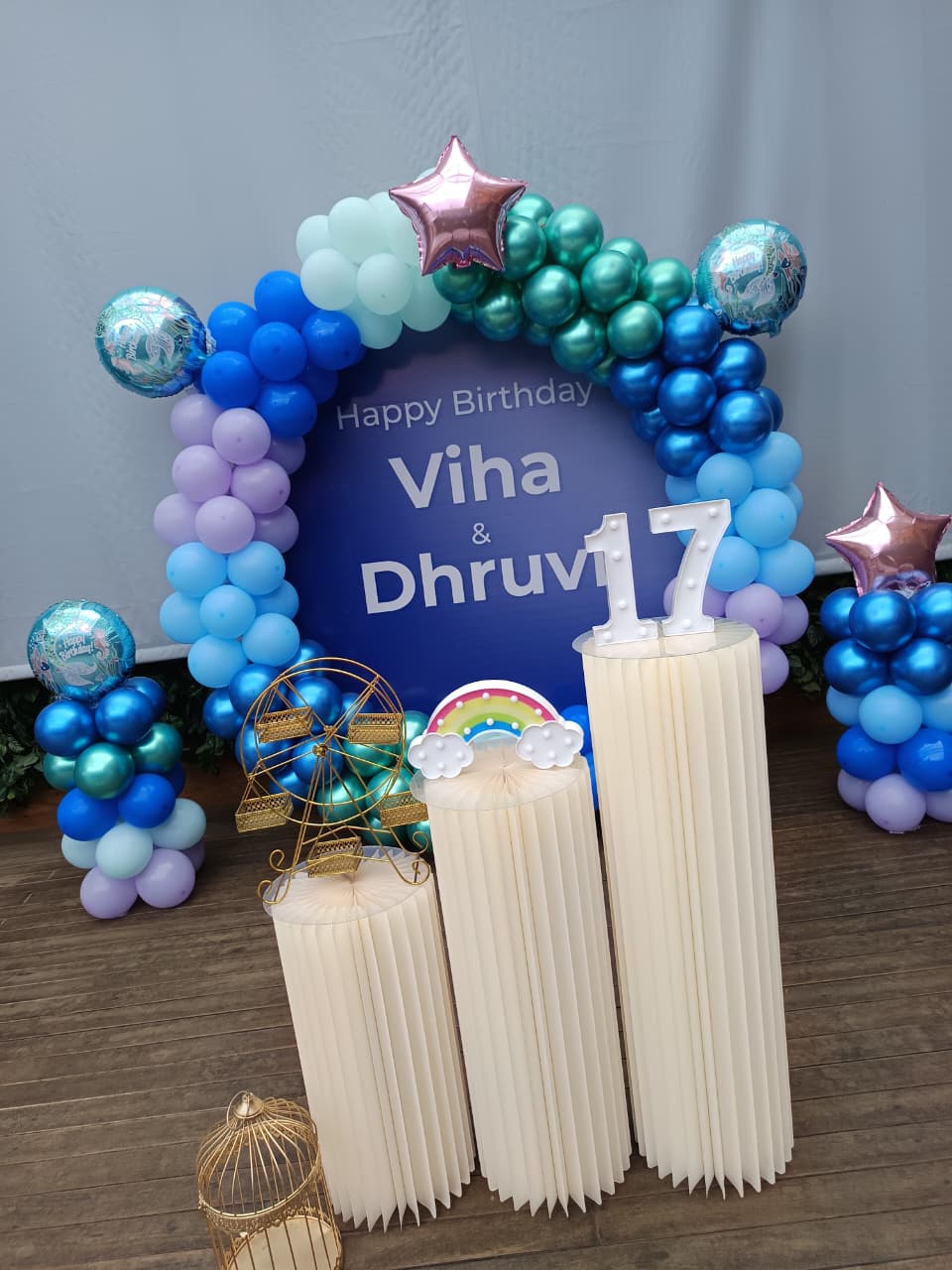 • Balloon arch of 250 balloons (Light blue, Pastel green, Dark blue, Green chrome, Dark Blue chrome and Blue chrome)